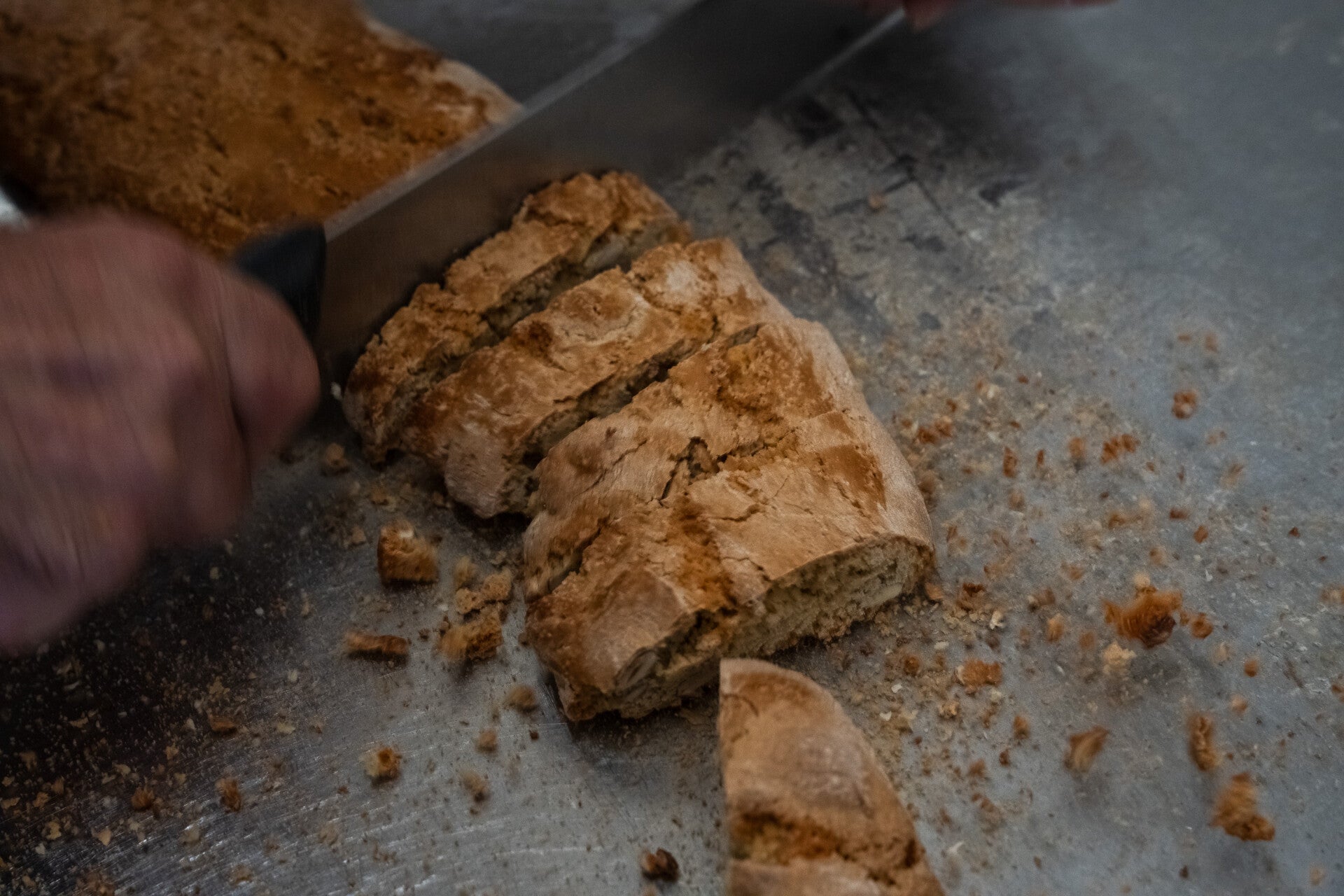 La particolarità del nostro cantuccio è che è grande e irregolare, questo perché ancora oggi tagliamo a mano ogni singolo biscotto appena sfornato.
